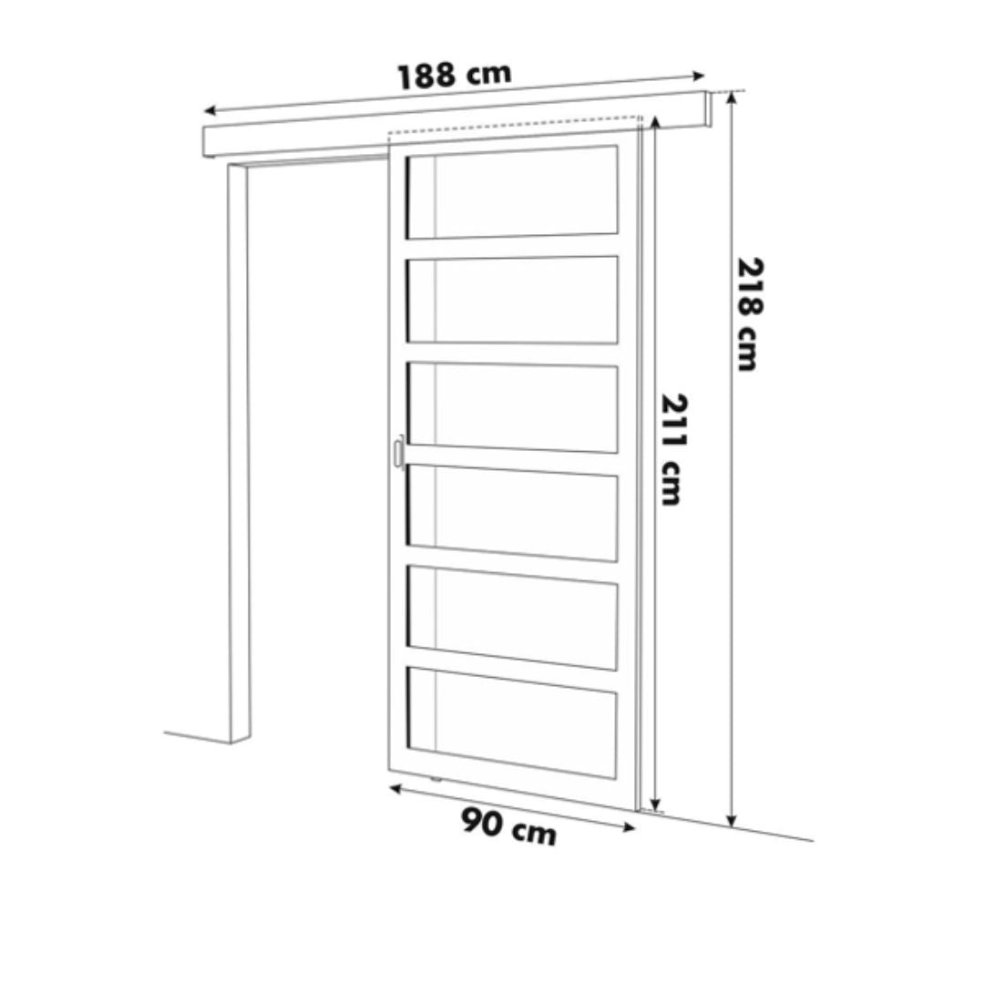 Afmetingen: L 90 cm x H 211 cm (deur) – rail: B 188 cm